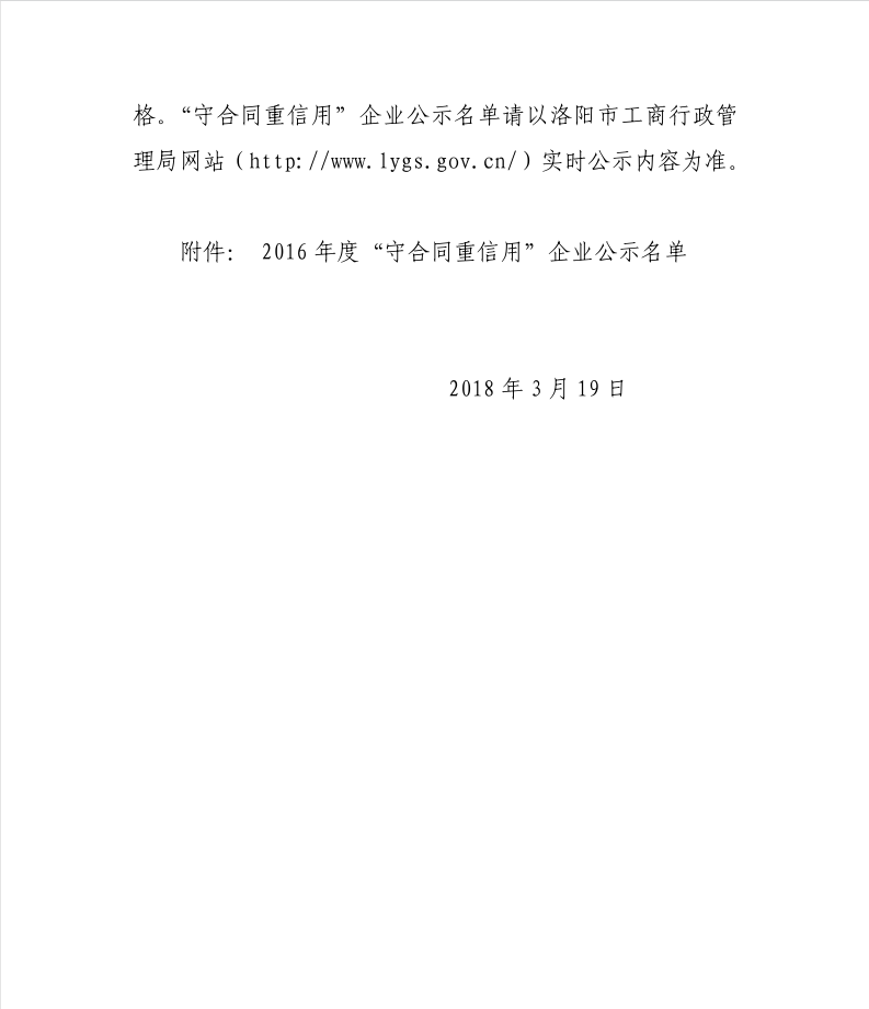 近期在洛陽市工商行政管理局公示的“2016年守合同重信用企業(yè)”名單中,我公司名列其中,同時(shí)還獲得了省守重企業(yè)稱號(hào)。
