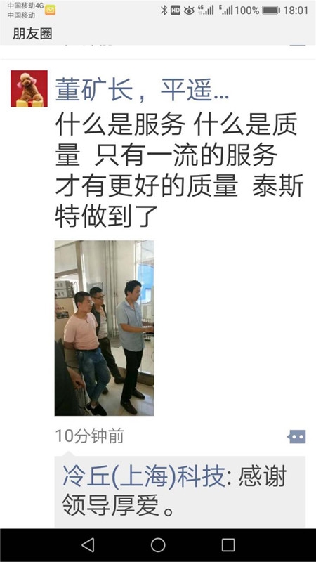 2018年6月28日,工程部技術(shù)工程師翟碩飛在平遙興盛鴻發(fā)礦進(jìn)行售后服務(wù)過程中,體現(xiàn)出的業(yè)與態(tài)度獲得了客戶的好評(píng),平遙煤化董礦長(zhǎng)將其轉(zhuǎn)發(fā)朋友圈,為泰斯點(diǎn)贊,高度贊揚(yáng)了泰斯業(yè)、負(fù)責(zé)、高的工作作風(fēng),這是次客戶在公開場(chǎng)合對(duì)公司進(jìn)行點(diǎn)贊,并進(jìn)行傳播。這是泰斯公司的光榮,也是整個(gè)售后團(tuán)隊(duì)的光榮。
