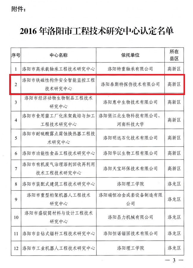 根據(jù)《洛陽(yáng)市工程技術(shù)研究中心管理辦法》(洛市科【200695號(hào))規(guī)定,經(jīng)組織申報(bào)、初審、現(xiàn)場(chǎng)考察、會(huì)議評(píng)審等評(píng)審程序,洛陽(yáng)泰斯探傷技術(shù)有限公司被認(rèn)定為洛陽(yáng)市鐵磁性構(gòu)件安智能監(jiān)控工程技術(shù)研究中心。