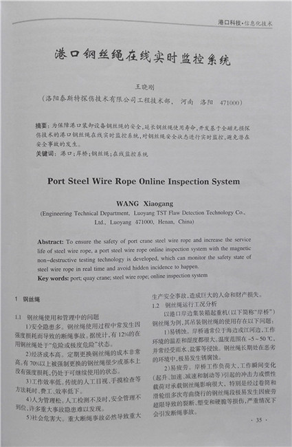 隨著公司新市場開拓不斷深入,市場反響逐漸升溫,尤其是面對港口行業(yè)對鋼絲繩安全問題關(guān)注度和解決方案渴求的急劇提升,針對港口行業(yè)的特殊工況環(huán)境和安規(guī)范要求,我公司和某港口達成戰(zhàn)略合作伙伴友好關(guān)系,為該港現(xiàn)場各類提升設(shè)備鋼絲繩提供安全監(jiān)測方案。豐富完備的港口現(xiàn)場數(shù)據(jù)和行業(yè)的鋼絲繩磁檢測技術(shù)結(jié)合成系列港口用鋼絲繩在線實時智能監(jiān)測系統(tǒng)。為了推而廣之向更多港口客戶提供TST產(chǎn)品保障安全的科技力量,同時也為了讓港口客戶對TST產(chǎn)品及技術(shù)方案在港口適用性有充分詳細的了解,TST 公司在港口行業(yè)權(quán)威性期刊《港口科技》20163月刊出《港口鋼絲繩在線實時監(jiān)控系統(tǒng)》論文。