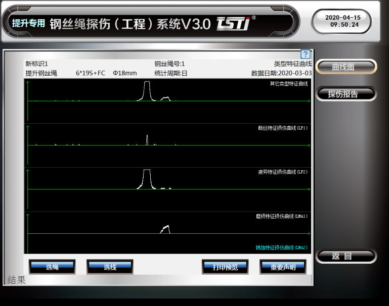 TST鋼絲繩探傷(工程)系統(tǒng)是一種針對(duì)各種工況提升鋼絲繩的損傷現(xiàn)象實(shí)時(shí)在線無損探傷的工程設(shè)備系統(tǒng)。該系統(tǒng)以“KJ578煤礦用鋼絲繩探傷系統(tǒng)”為硬件平臺(tái),搭載“TST鋼絲繩探傷(工程)系統(tǒng)V4.0”專業(yè)分析軟件,采用“變量補(bǔ)償傳感器”、“三維磁感應(yīng)橋”和“自平衡同步勵(lì)磁”等無損探傷專利技術(shù)綜合集成可全天候無人值守在線實(shí)時(shí)探測鋼絲繩內(nèi)外部斷絲、銹蝕、疲勞、磨損及變形等各種損傷隱患,通過LMA曲線分析,評(píng)估鋼絲繩的使用壽命。